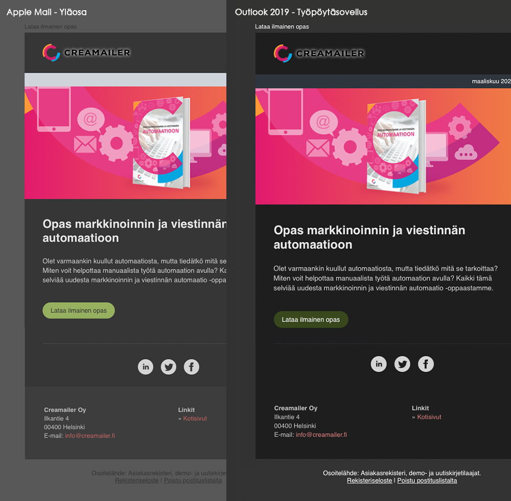 Tumma tila alaosa - Apple Mail vs Outlook 2019